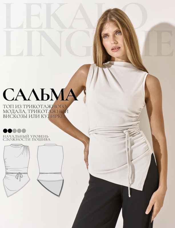 Топ прилегающего силуэта. На переде в левом плечевом шве сборка, также сборка в правом боковом шве. Пройма обрабатывается бейкой из основного материала. Низ переда ассиметричный, треугольной формы, низ спинки прямой. Воротник-стойка. Завязка-шнур на талии из основного материала.