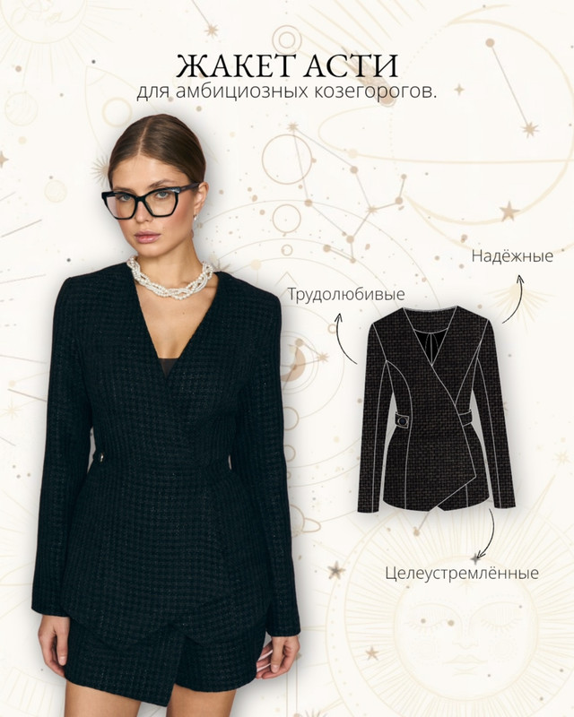 Жакет женский умеренного объема, приталенного силуэта, на притачной подкладке. Прилегание по полочкам и спинке достигается рельефами и поясом из бокового шва с застёжкой на пуговицу на правом боку. Вырез декольте треугольной формы. Спинка со средним швом. На полочках низ треугольной формы, на спинке - прямой. Рукава втачные длинные двухшовные. Спинка на обтачке. Однобортная застежка на 2 металлические кнопки. Длина жакета на уровне линии бедер.